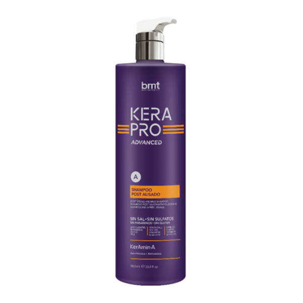 Shampoo pós alisamento BMT Kerapro Advanced com fórmula livre de formol com KerAmin-A e Thermoliss Protection. Consegue, em apenas 2 passos, óptimos resultados em todos os tipos de cabelos, sem danificar.